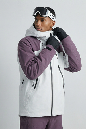 A windproof high-collar with elastic ropes enhances performance and improves warmth retention.