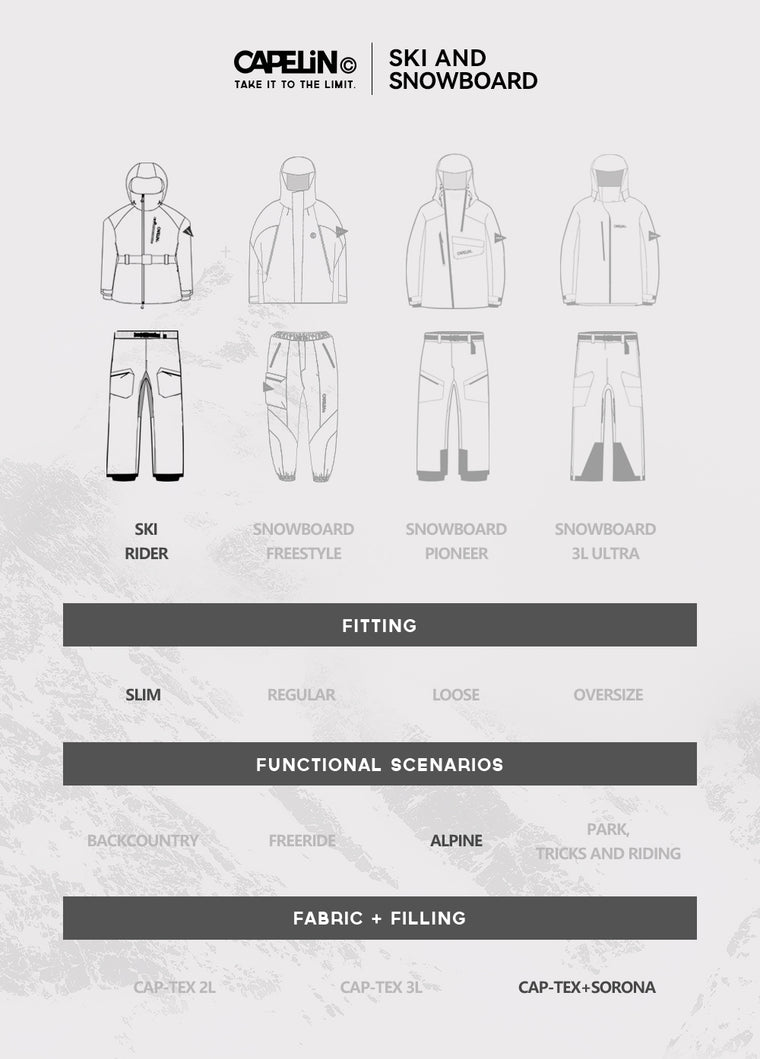 整件夾克的接縫處均採用壓膠。接縫是任何服裝的最薄弱點。 CapelinCrew 採用特殊膠帶確保水不會滲入,讓您放心地在斜坡上騎行