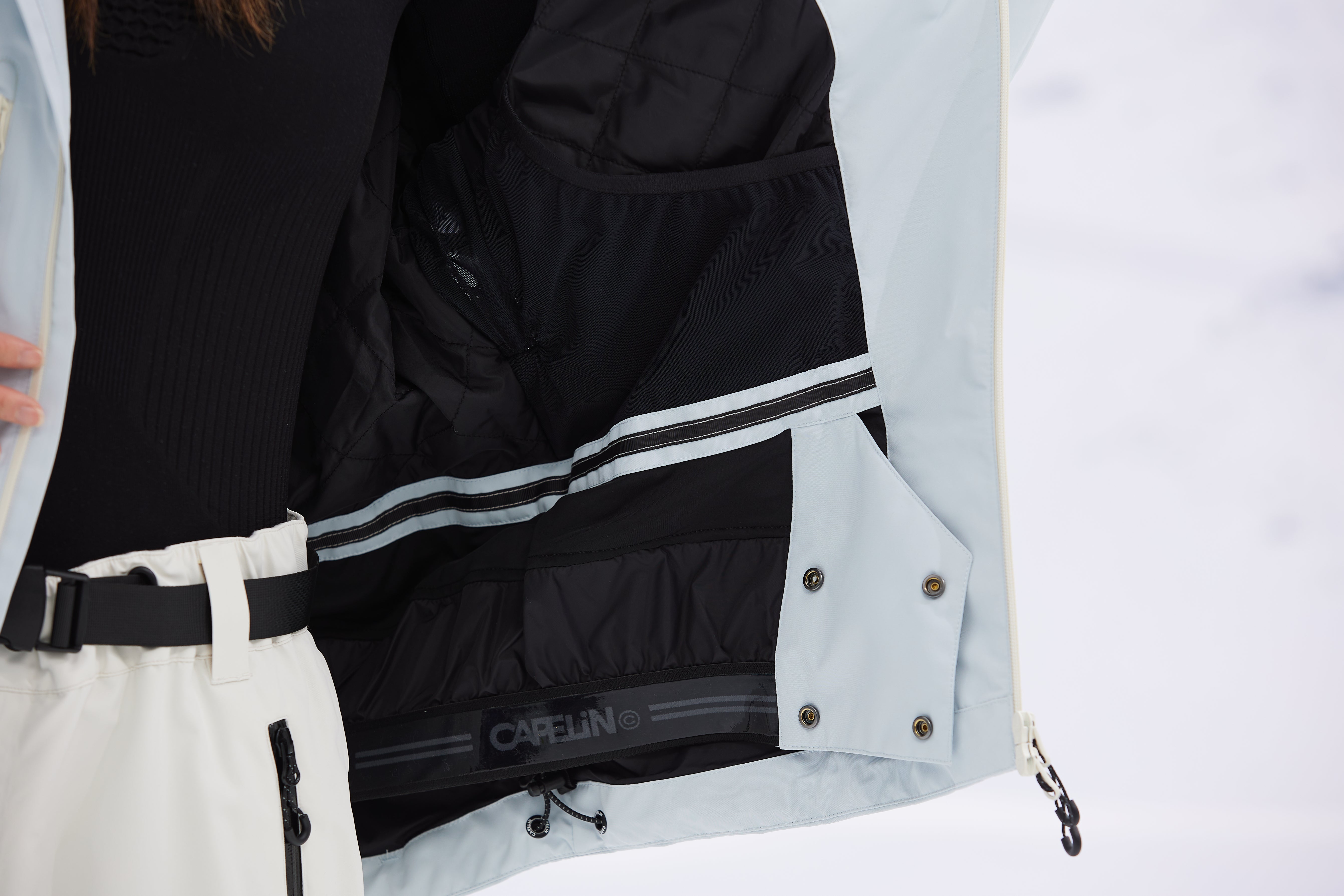 整件夾克的接縫處均採用壓膠。接縫是任何服裝的最薄弱點。 CapelinCrew 採用特殊膠帶確保水不會滲入,讓您放心地在斜坡上騎行