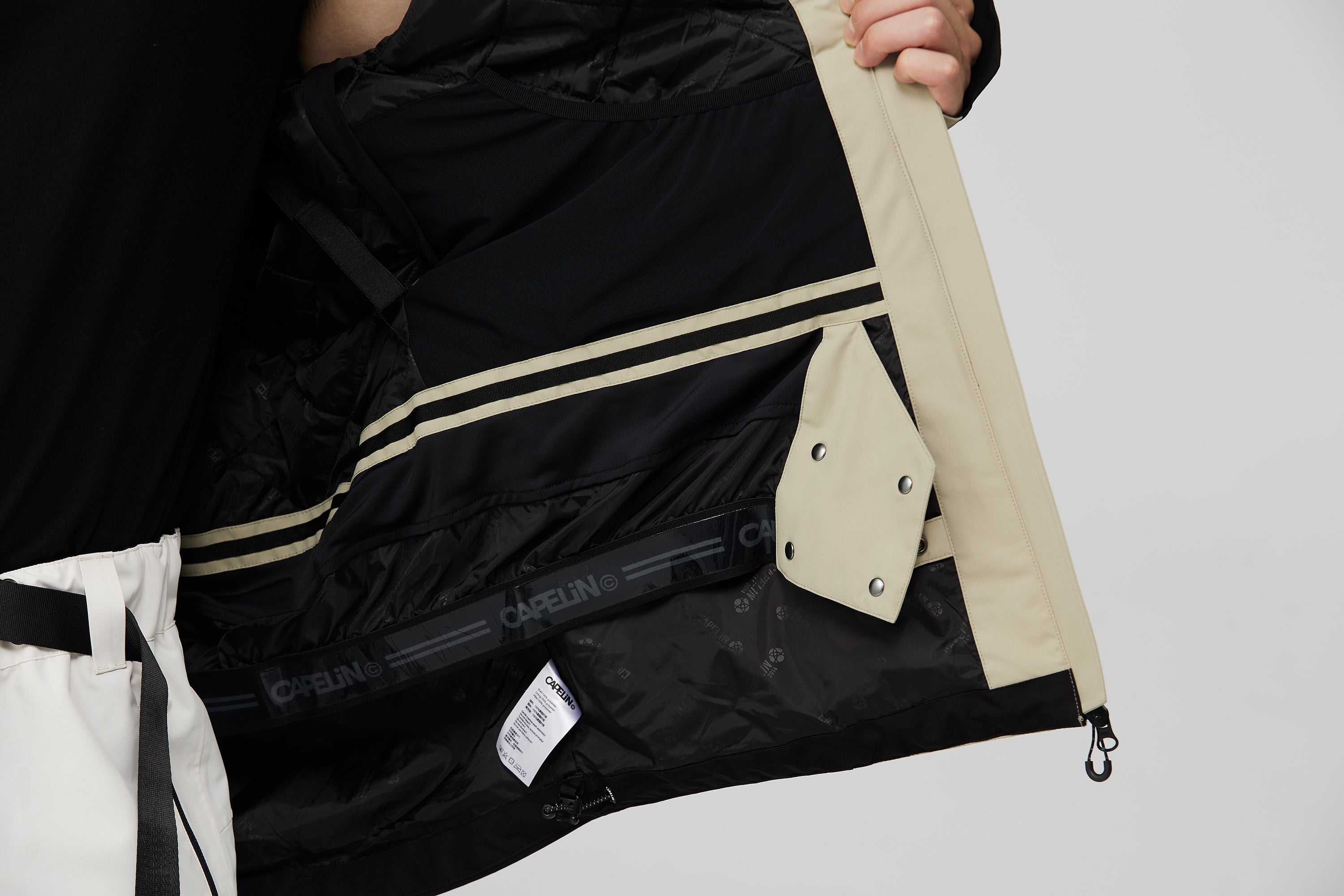 整件夾克的接縫處均採用壓膠。接縫是任何服裝的最薄弱點。 CapelinCrew 採用特殊膠帶確保水不會滲入,讓您放心地在斜坡上騎行
